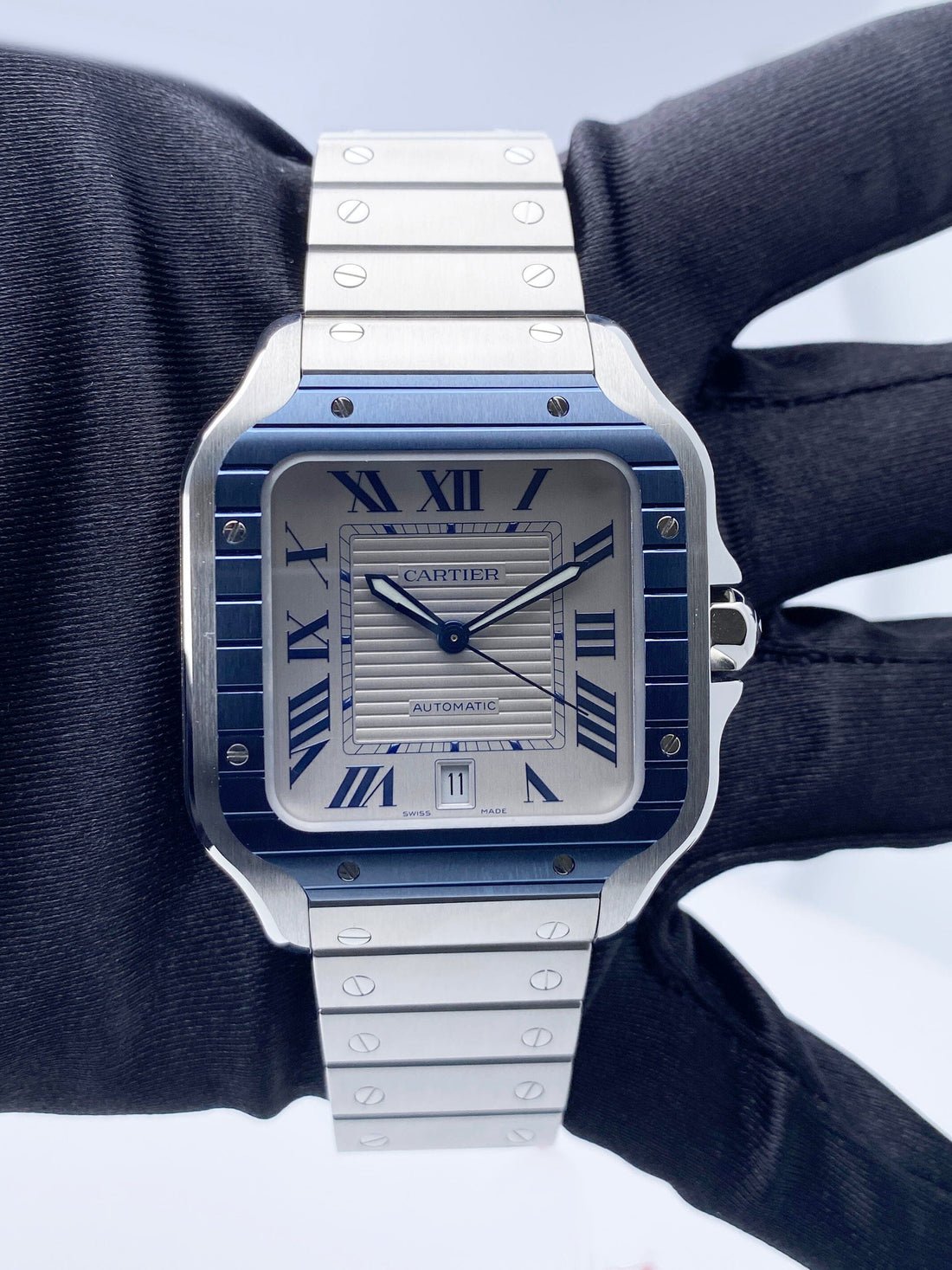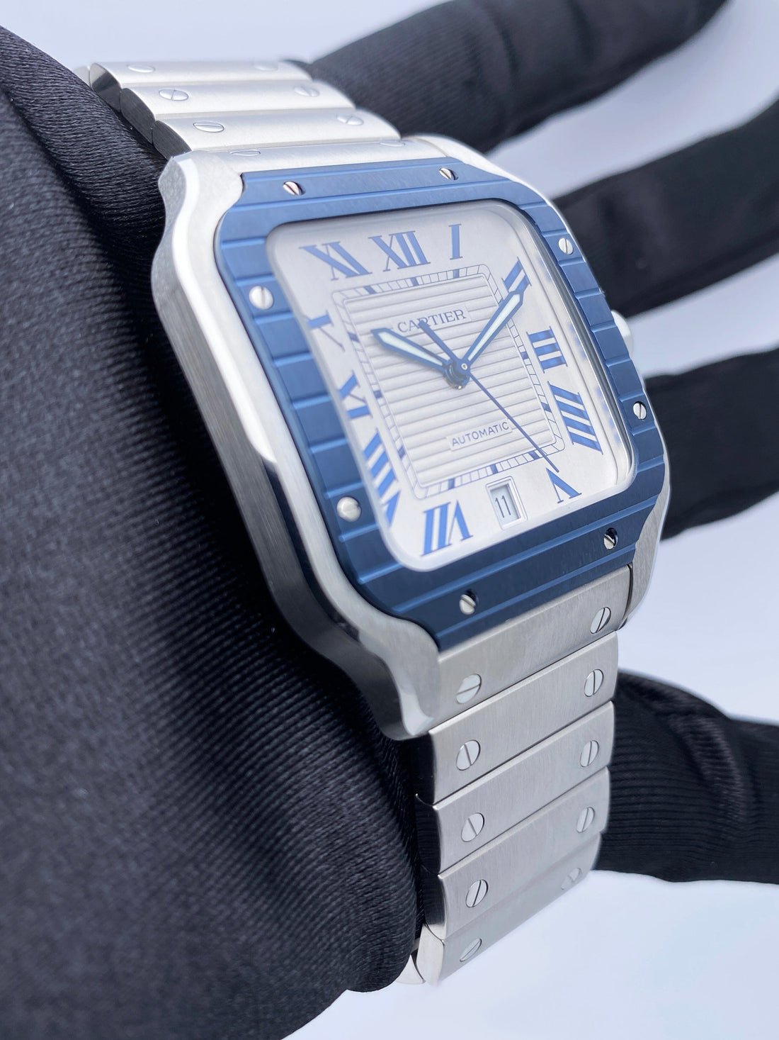 Cartier Santos Stainless Steel Large Blue PVD Bezel White Dial